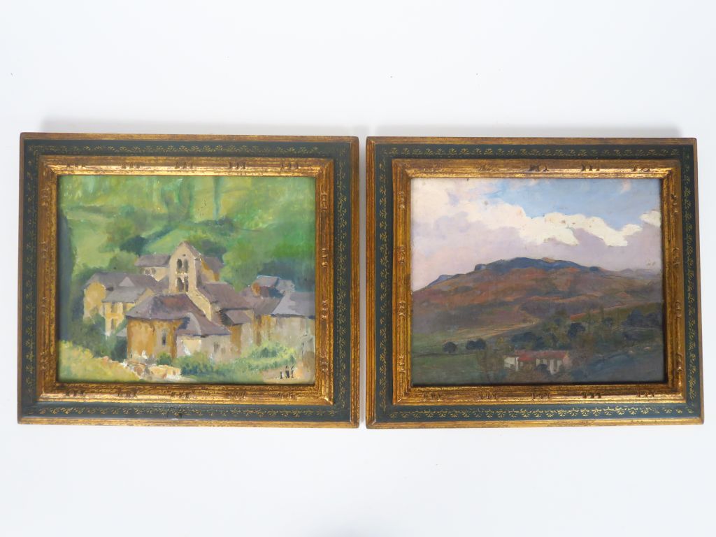 Cécile Patrice BONNET "Paysages montagneux" et "Vue de hameau" Deux huiles sur panneau et deux huiles sur carton. Non signées. 27 x 21,5 cm - 21,5 x 27 cm - 34,5 x 27 cm