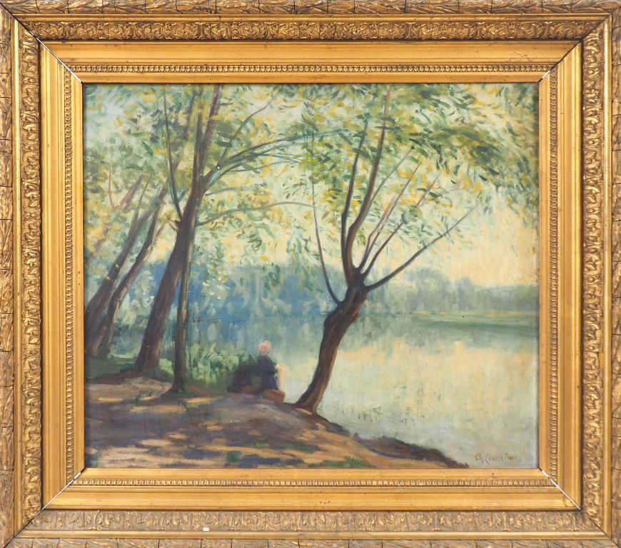 Ch. COUSSEDIERE. "Paysage lacustre". Huile sur panneau, signée en bas à droite. Dim 46 x 54 cm