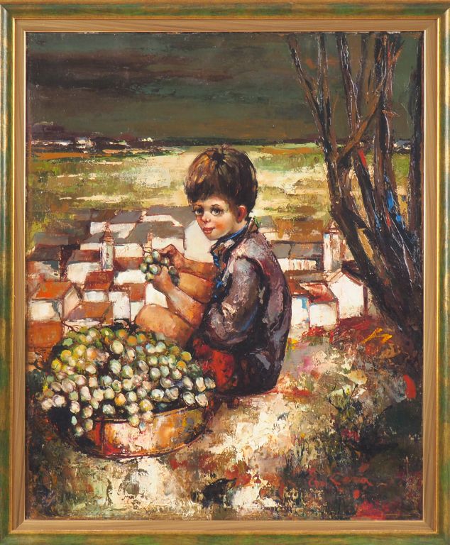 CORIA. "Enfant à la grappe de raisin". Huile sur toile, signée en bas à droite. Dim. 62 x 50 cm.