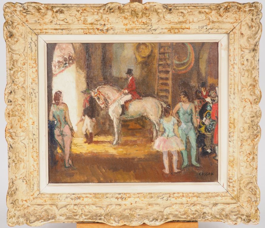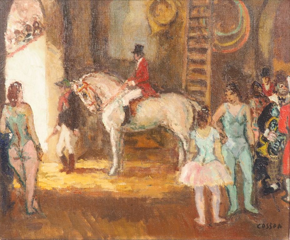 COSSON "Les coulisses du cirque". Huile sur toile, signée en bas à droite Dim. 38 x 46 cm
