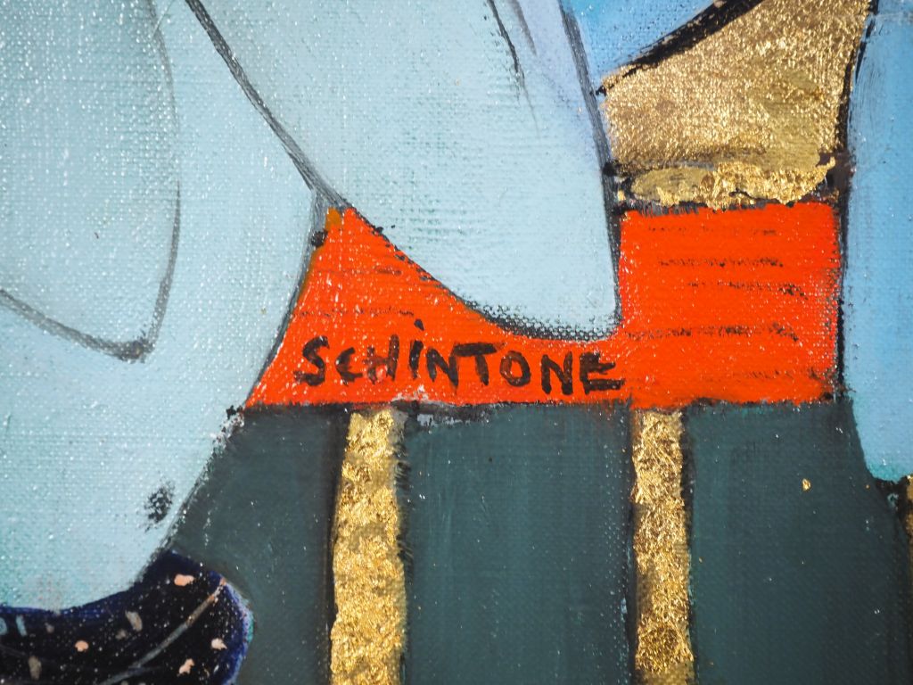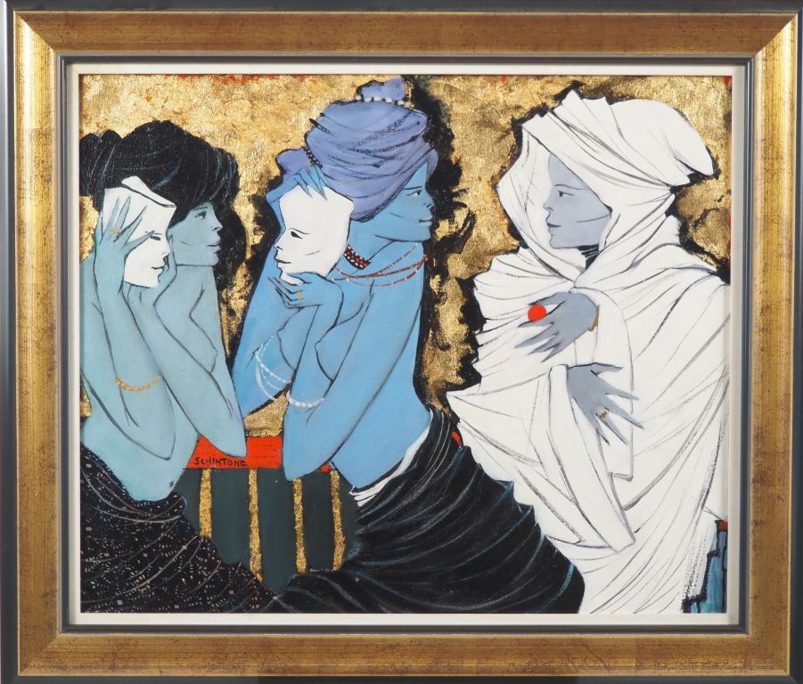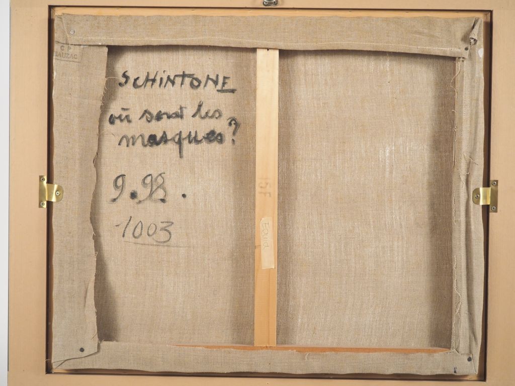 Daniel SCHINTONE. "ou sont les masques" Huile sur toile, signée en bas à gauche Dim. 54,5 x 60,5 cm