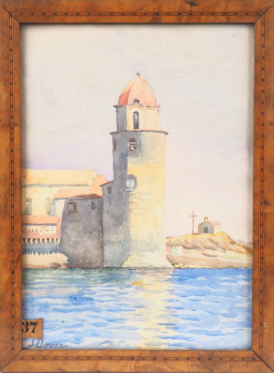 DOUZON. "Le clocher de Collioure". Aquarelle, signée en bas à gauche. Dim. 38,5 x 25 cm