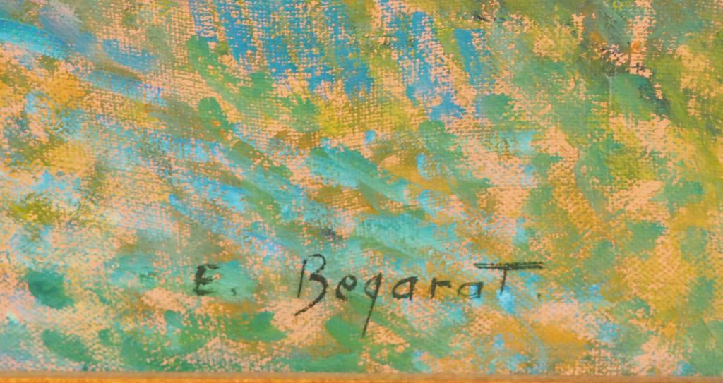 E. BEGARAT. "Bretonnes devant leur maison". Huile sur toile, signée en bas à droite. Dim. 89 x 116 cm