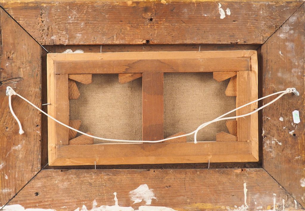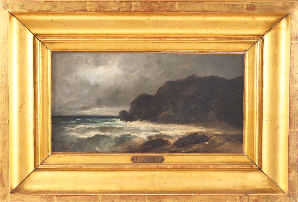 E . ISABEY (attribué à). "côte rocheuse sous l'orage". Huile sur toile, signée en bas à gauche. Dim. 21.5 x 40.5 cm. (Réentoilée)