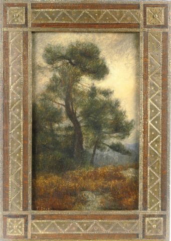 E. LOUP "Sapins sous l'orage". Huile sur panneau, signée en bas à gauche. 36,5 x 22 cm