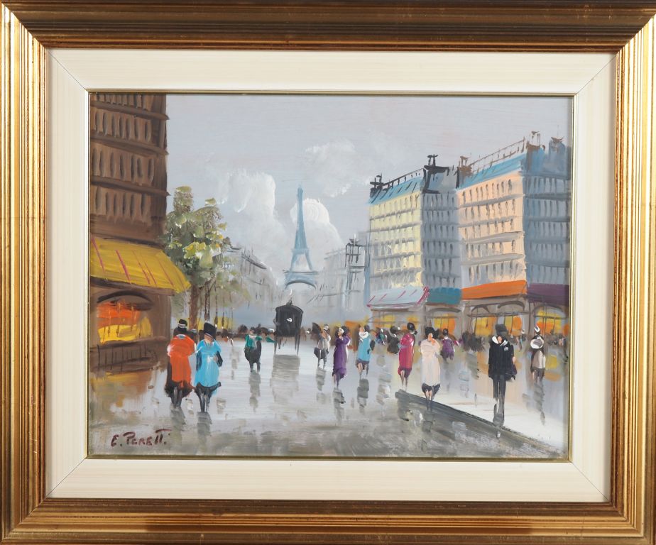 E. PERETTI. "Paris, la tour Eiffel" Huile sur carton, signée en bas à gauche Dim. À vue : 29 x 38,5 cm