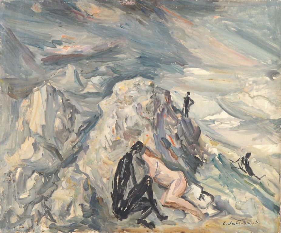 E. SABOURAUD. "Couple dans un paysage fantastique" Huile sur toile, signée en bas à droite Dim. 54,5 x 65,5 cm