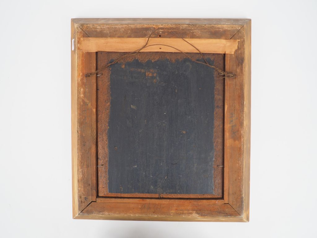 Ecole anglaise XIXème "Charrette de foins et paysans" Huile sur panneau. Signée en bas à droite. 31,7 x 27,5 cm