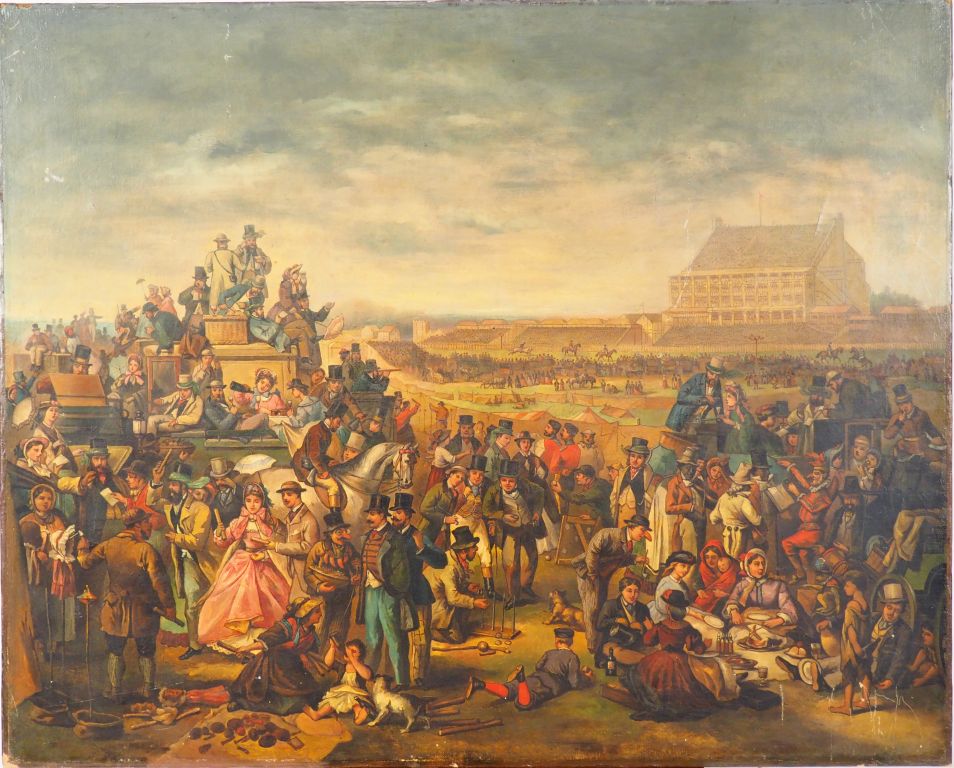 Ecole anglaise XIXème "Fête et pique-nique sur un champs de courses" Huile sur toile. Dim. 65 x 80 cm