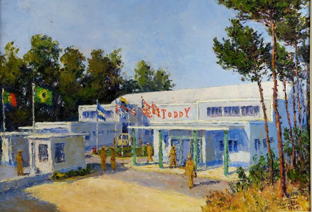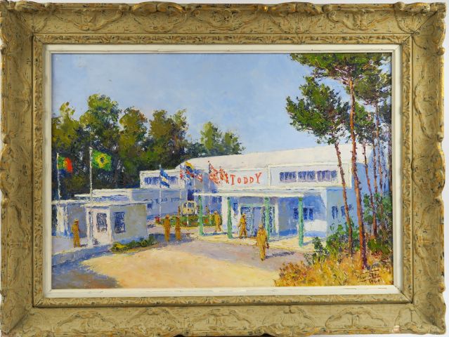 Ecole brésilienne XXème "La sortie de l'usine Toddy". Huile sur isorel, signée et datée 1960 en bas à droite. 52 x 75 cm
