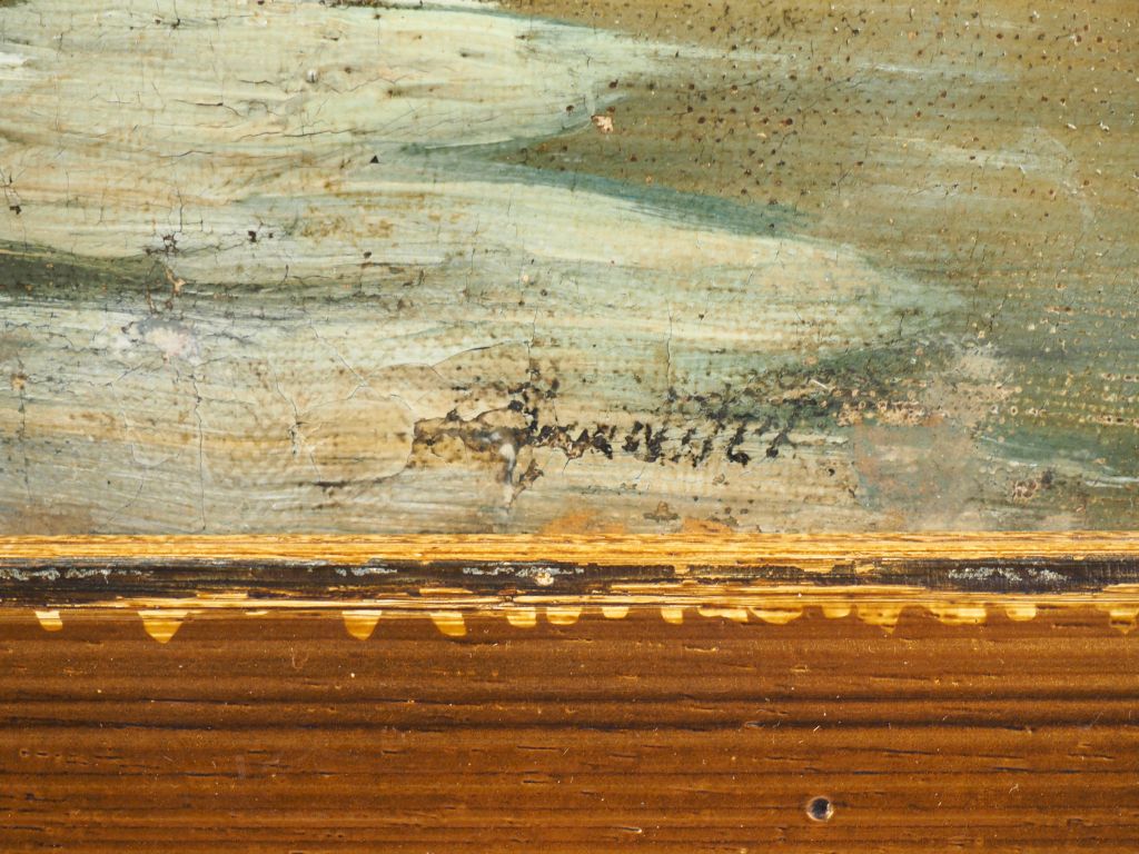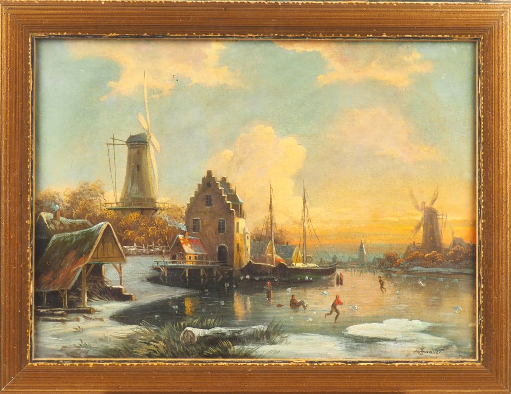 Ecole du Nord XIXème. "Les patineurs". Hule sur toile, signée en bas à droite (illisible). Dim. 34,5 x 47,5 cm. (toile détendue, petits trous).