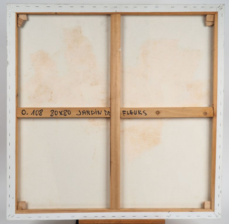 Ecole française contemporaine. "Jardin de fleurs". Huile sur toile, titrée au dos. Dim. 80 x 80 cm.