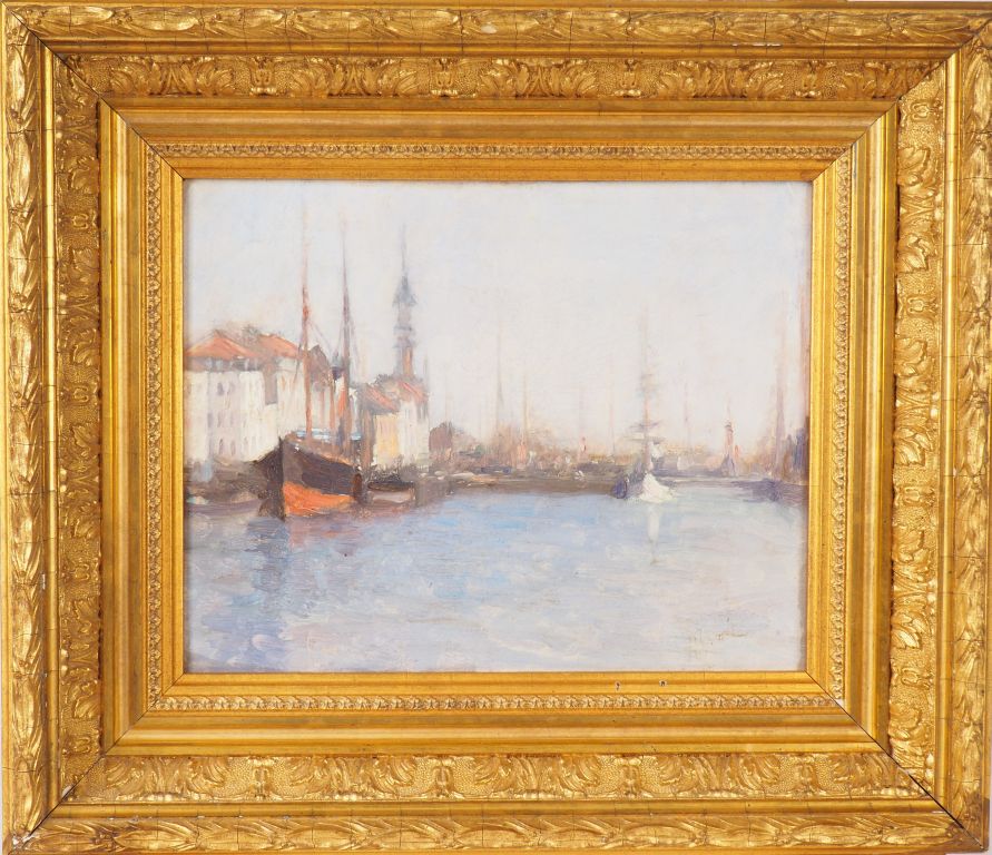 Ecole française début Xxème. "Bateaux dans le port". Huile sur isorel. Signée en bas à droite (illisible). Dim. 19 x 24,5 cm.