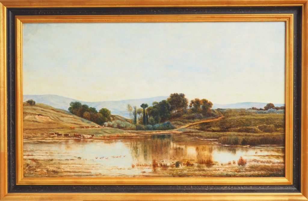 Ecole francaise début Xxème "Paysage lacustre au troupeau". Huile sur toile Dim. 33 x 55 cm