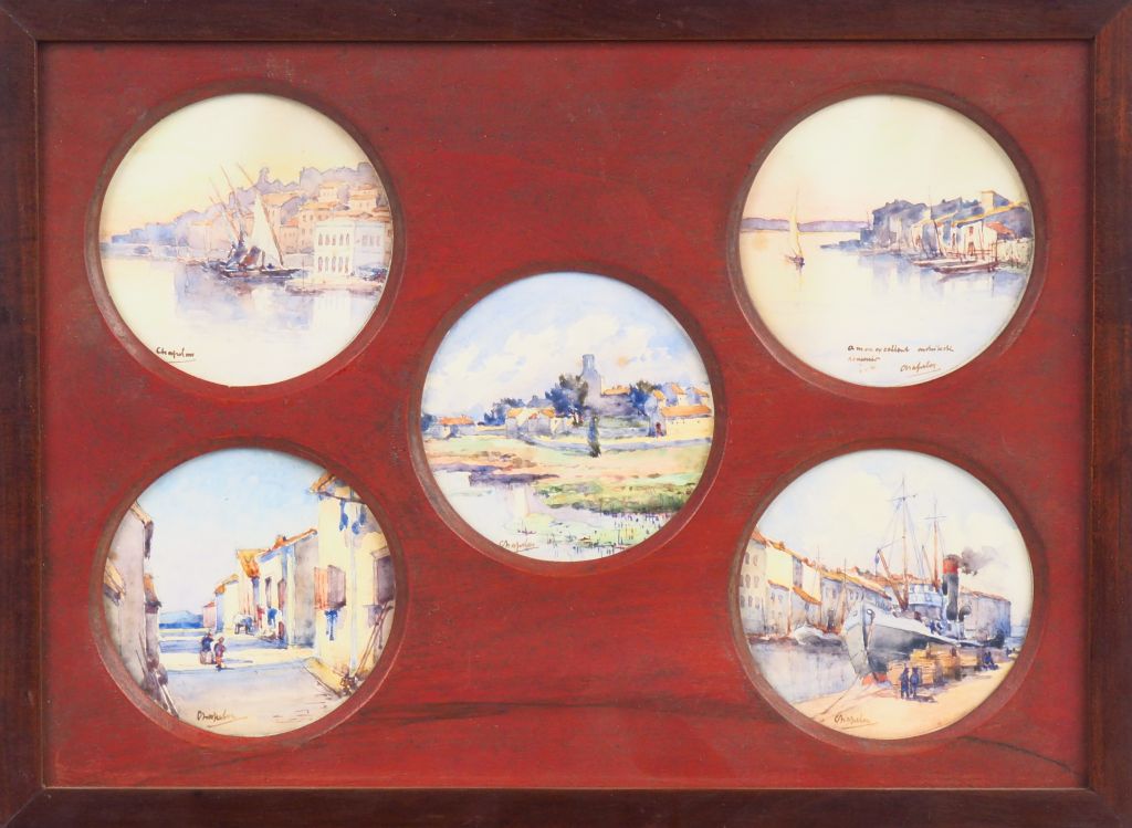 Ecole française fin XIXème début XXème. "Paysages de bord de mer dans le Midi". 5 aquarelles dans un même encadrement signées en bas à droite (illisible). Diam. 9 cm
