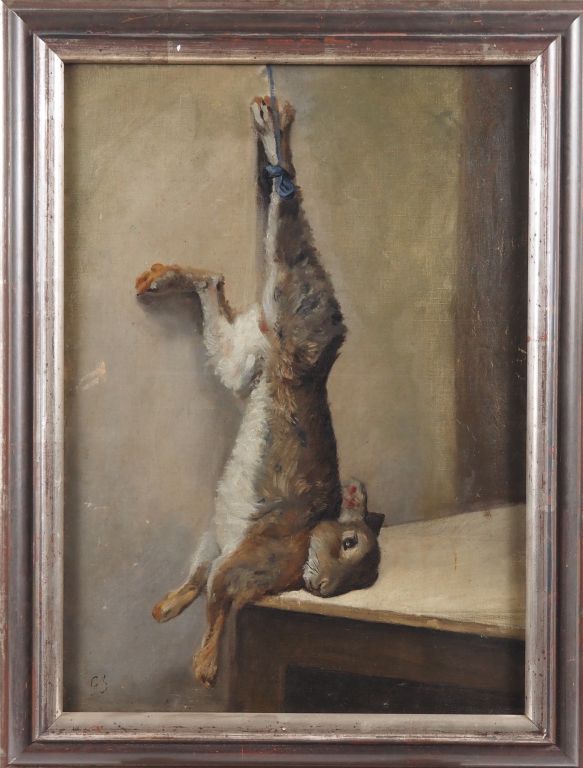Ecole française fin XIXème - début XXème. "Trophée de chasse". Huile sur toile monogrammée en bas à gauche. Dim. 61 x 44 cm.