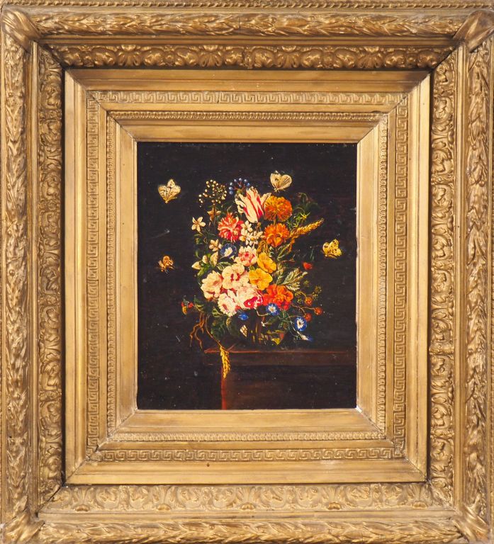 Ecole française fin XIXème. "Fleurs et papillons". Huile sur panneau. Dim. 26,5 x 23,5 cm.
