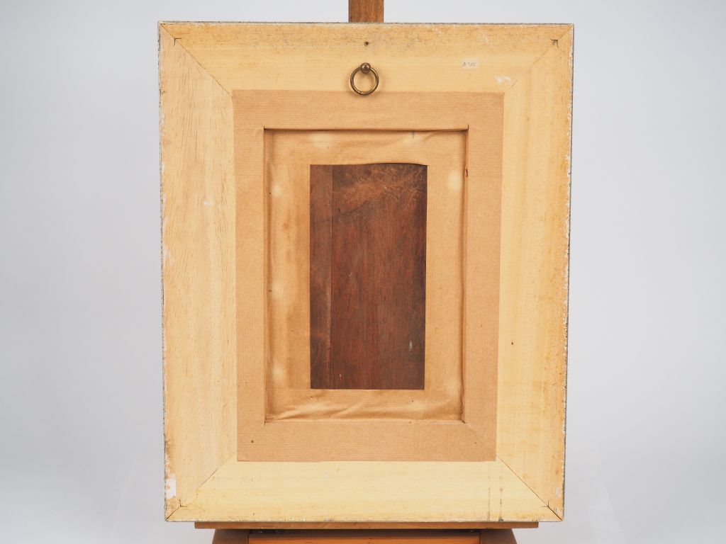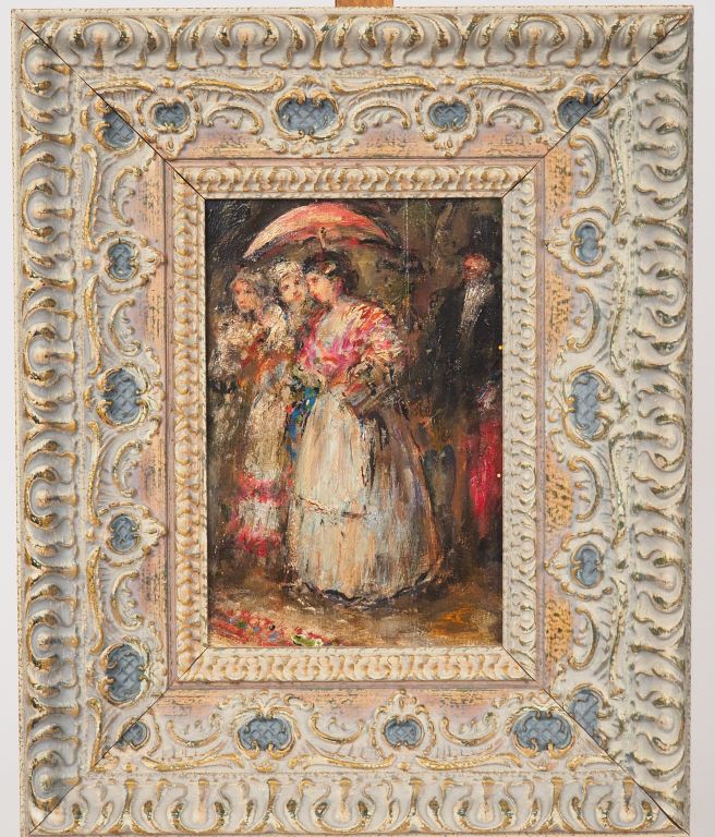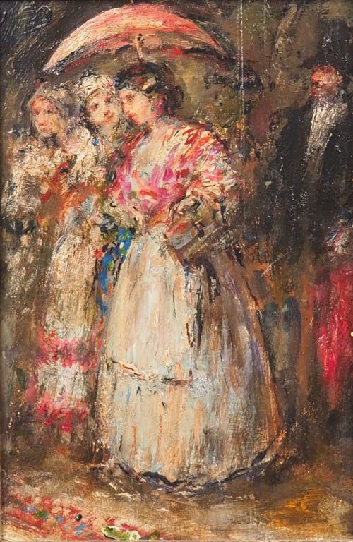 Ecole française vers 1900 "Elégantes à l'ombrelle" Huile sur panneau d'acajou Dim. 26,5 x 18 cm