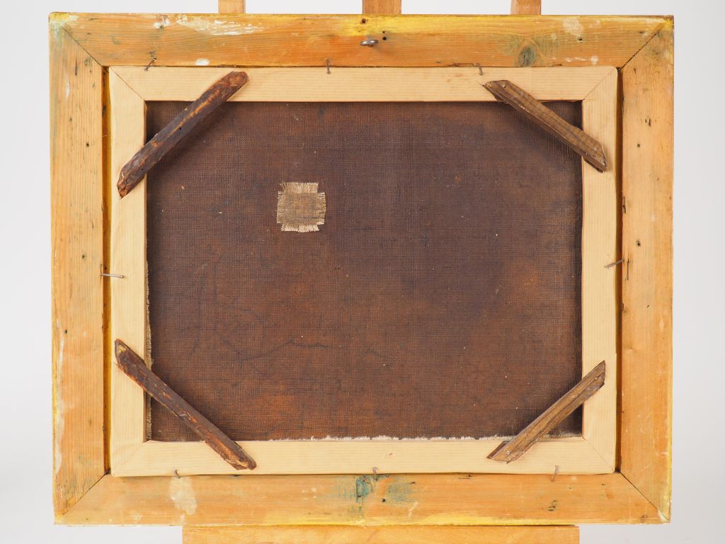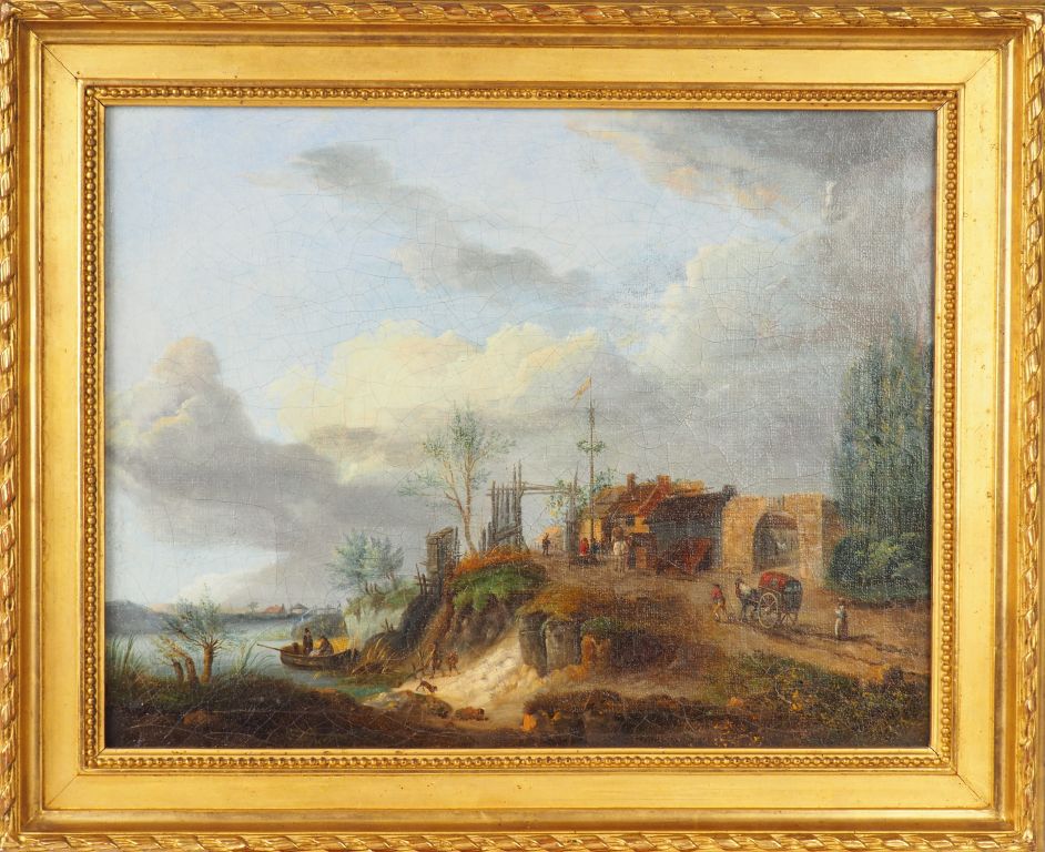 Ecole française XIXème. "Entrée de village près de la rivière". Huile sur toile marouflée. Dim : 32 x 40 cm. (Craquelures et restauration).