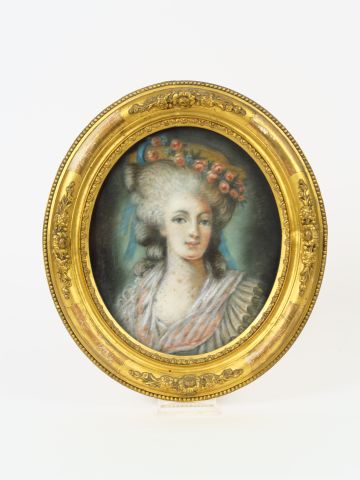 Ecole française XIXème "Portrait de jeune fille à la couronne de fleurs" Pastel dans un cadre en médaillon en bois et stuc doré Dim. 22,5 x 19,5 cm
