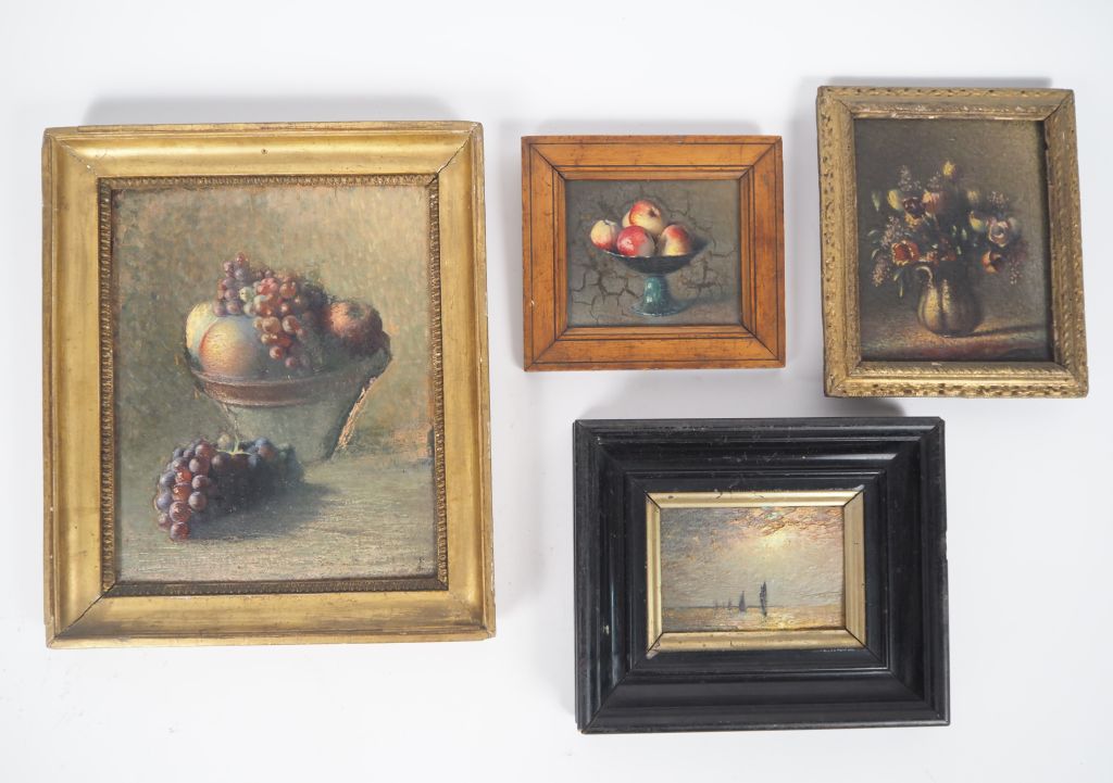 Ecole française XXème. 4 tableautins "nature morte" et "marine" Huiles sur panneaux Dim. 27 x 21 cm - 18 x 14 cm - 10 x 15,5 cm - 10 x 12 cm