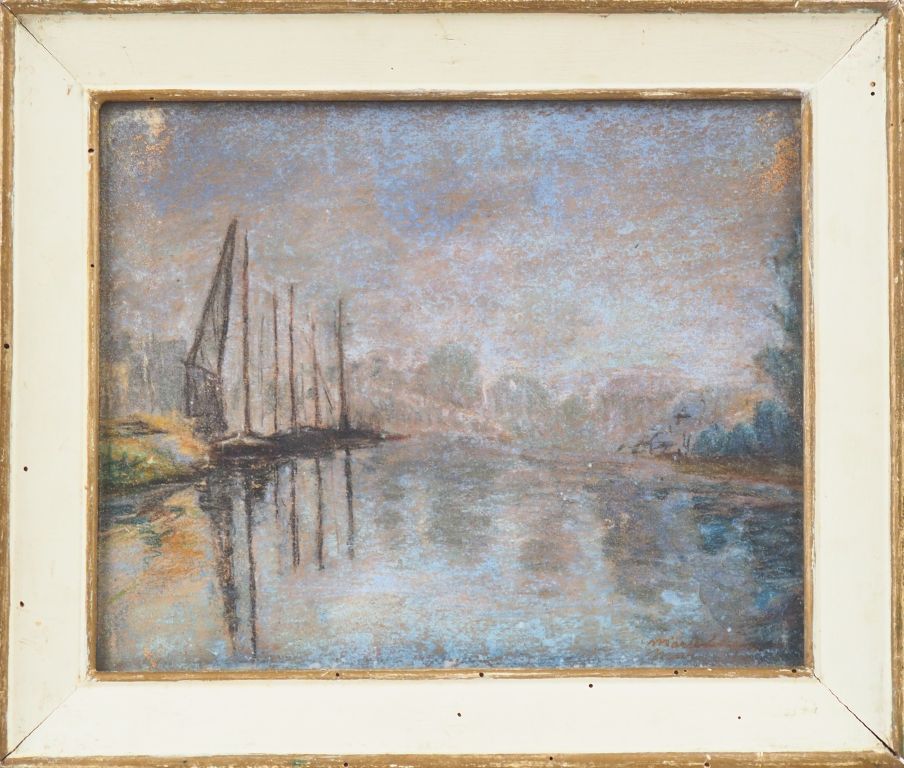 Ecole française XXème. "Bord de canal". Pastel, signé en bas à droite. Dim. (à vue) : 23 x28,5 cm.
