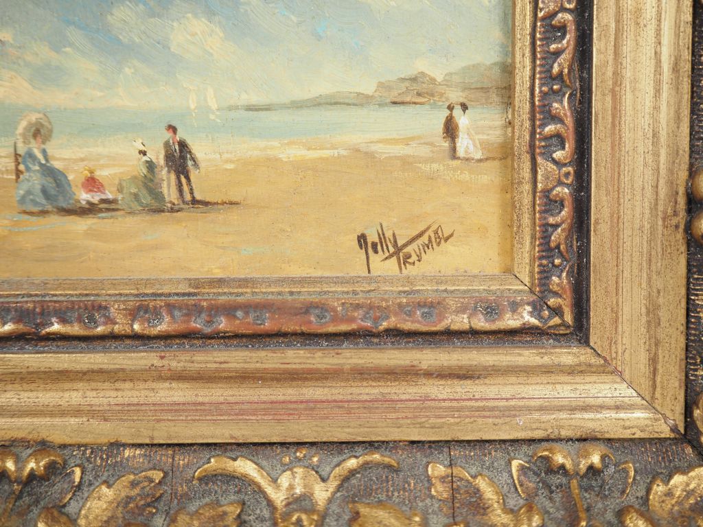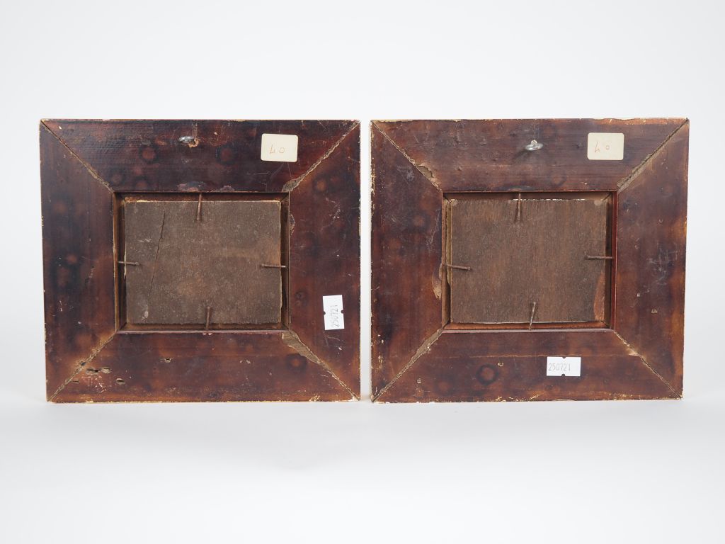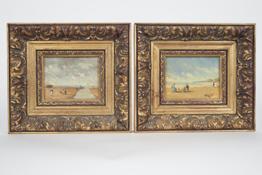 Ecole française XXème. "bord de mer animé" Paire d'huiles sur panneaux, signées en bas à droite Dim. 7,5 x 9,5 cm
