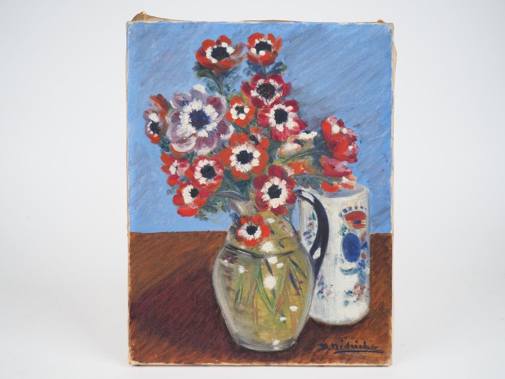 Ecole française XXème. "Bouquet d'anémones". Huile sur toile signée en bas à droite. Dim. 35 x 27 cm.