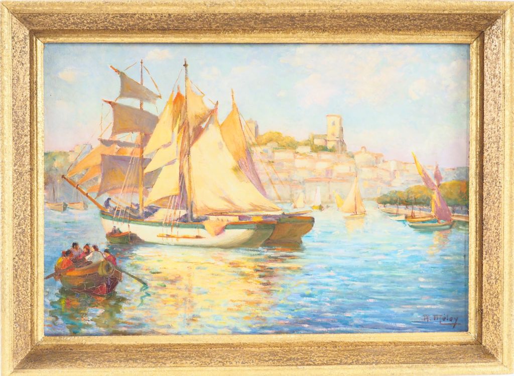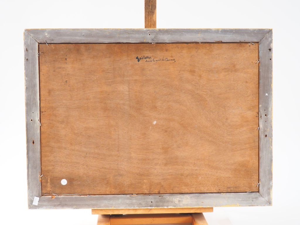 Ecole française XXème. "Goélettes dans le port de Cannes". Huile sur panneau signée en bas à droite. Dim. 38,5 x 55,5 cm.