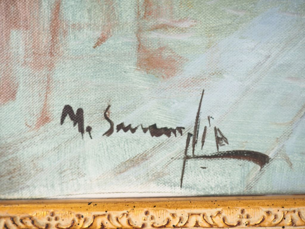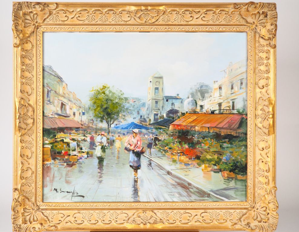 Ecole française XXème. "Le marché aux fleurs". Huile sur toile, signée en bas à gauche. Dim. 50 x 60,5 cm.
