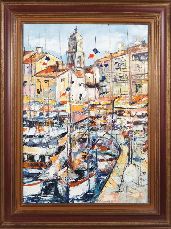 Ecole française XXème. "Le port de Saint Tropez". Huile sur toile signée en bas à droite. Dim. 65 x 46 cm.