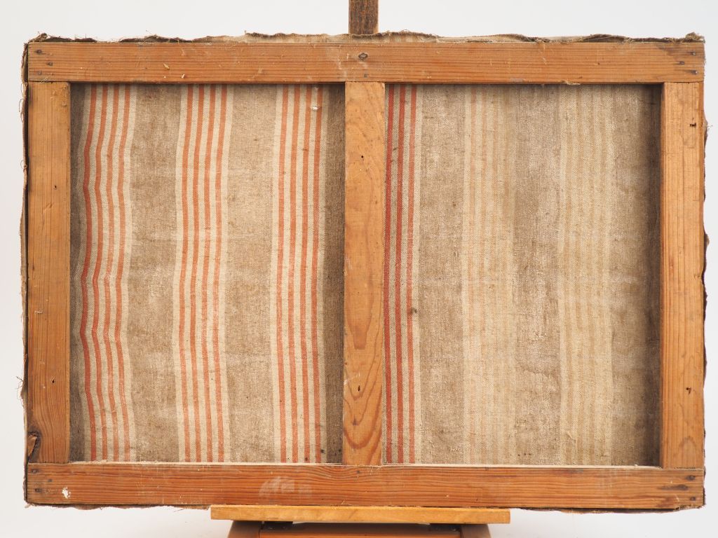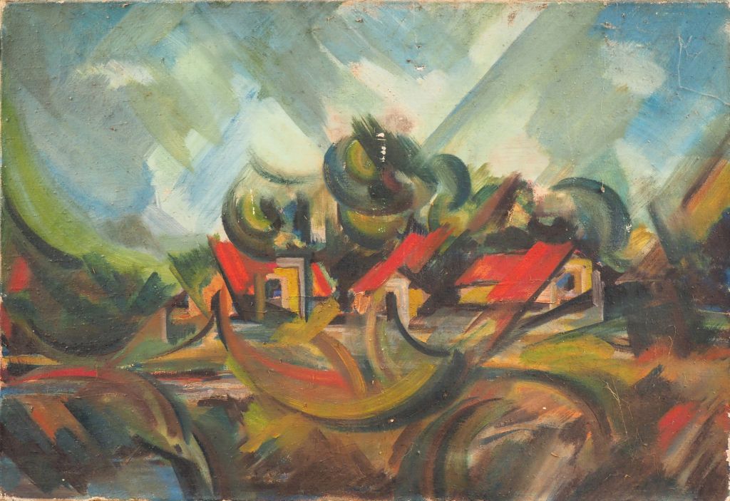 Ecole française XXème. "Paysage cubiste". Huile sur toile. Dim. 50 x 37 cm. (Manques, 2 trous).