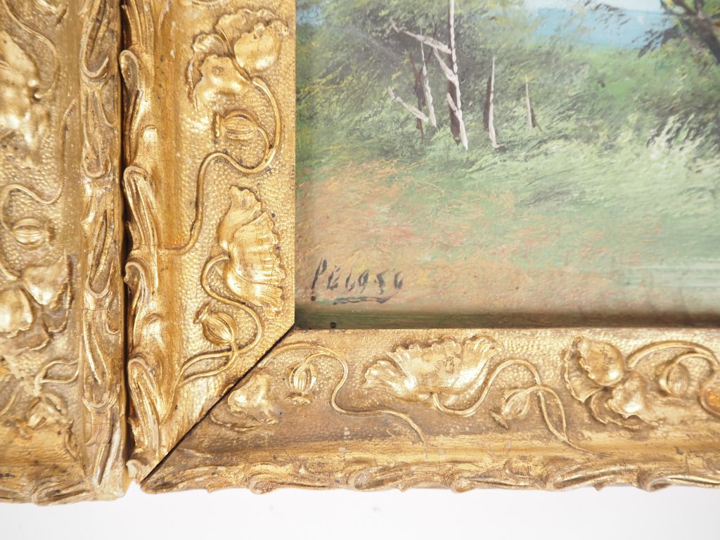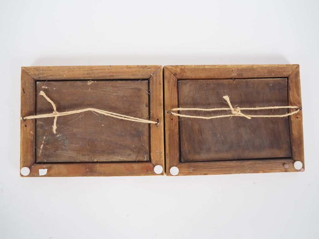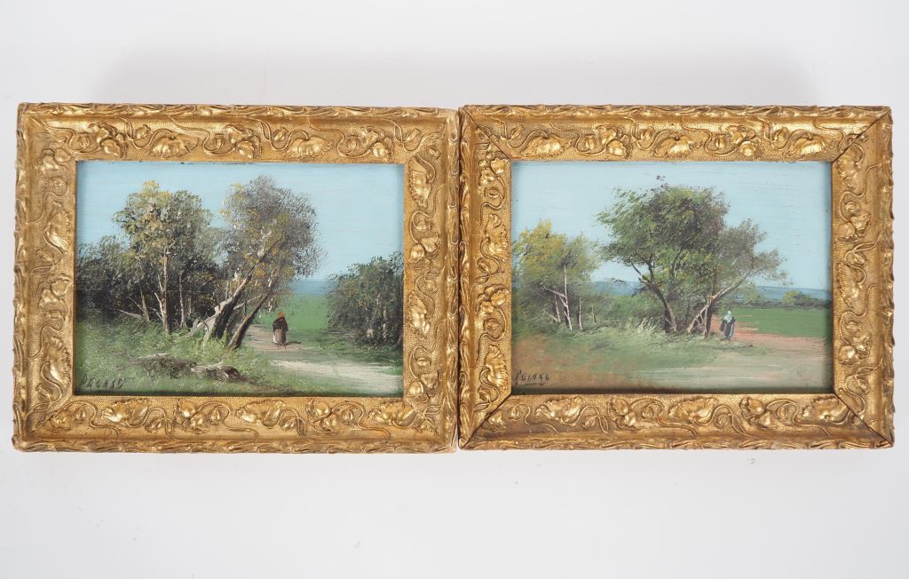 Ecole française XXème "paysages animés" Paire d'huiles sur panneau, signées en bas à gauche Dim. 15,5 x 22 cm jolis cadres en stuc à décor de pavots