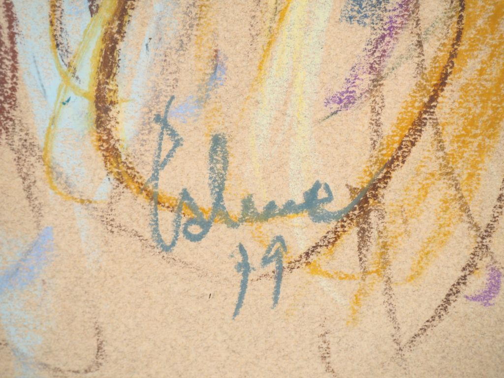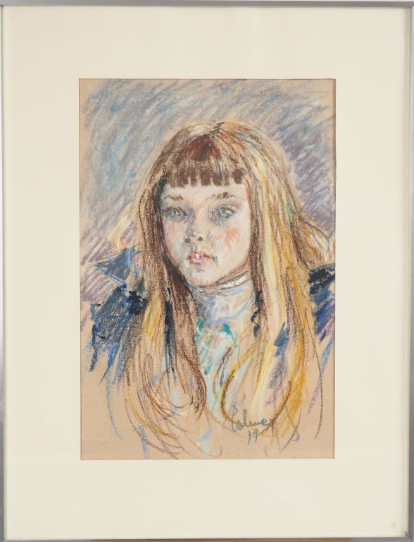 Ecole française XXème. "Portrait de jeune fille à frange". Dessin au crayon gras signé en bas à droite et daté 79. Dim. À vue : 46 x 30,5 cm.