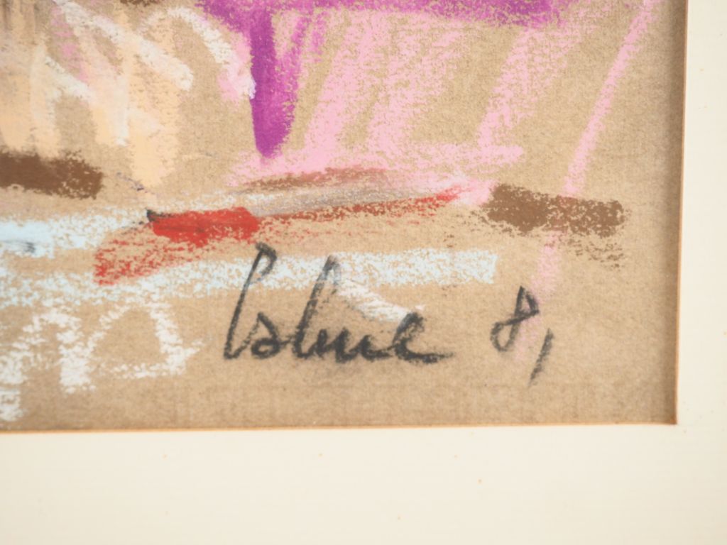 Ecole française XXème. "Portrait de jeune fille à la robe rose". Dessin au crayon gras signé en bas à droite et daté 81. Dim. 47 x 31 cm.