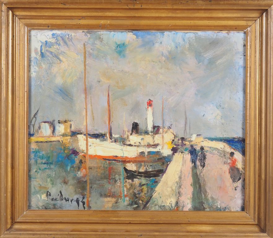 Ecole française XXème. René ? "le port" Huile sur toile, signée en bas à gauche Dim. 46,5 x 55,5 cm