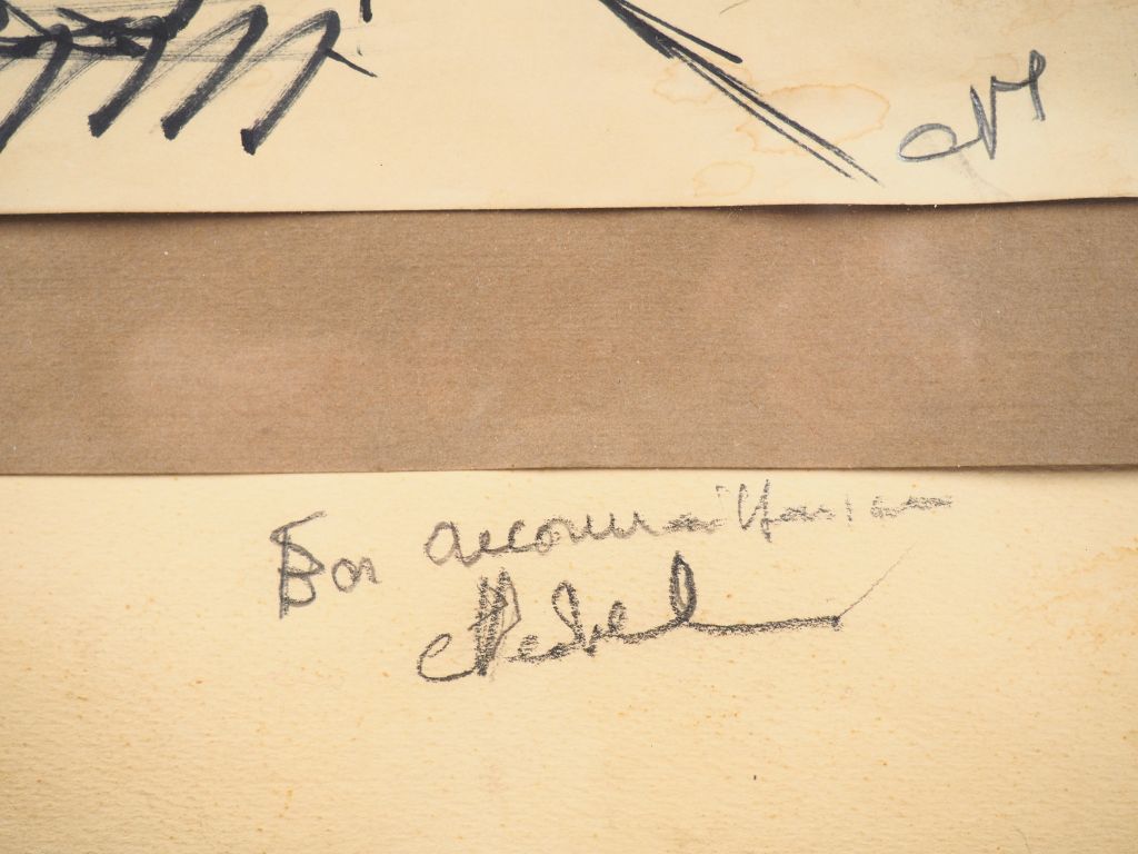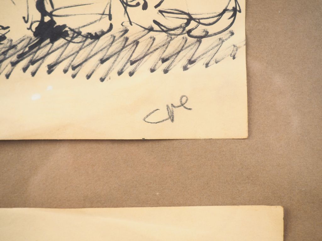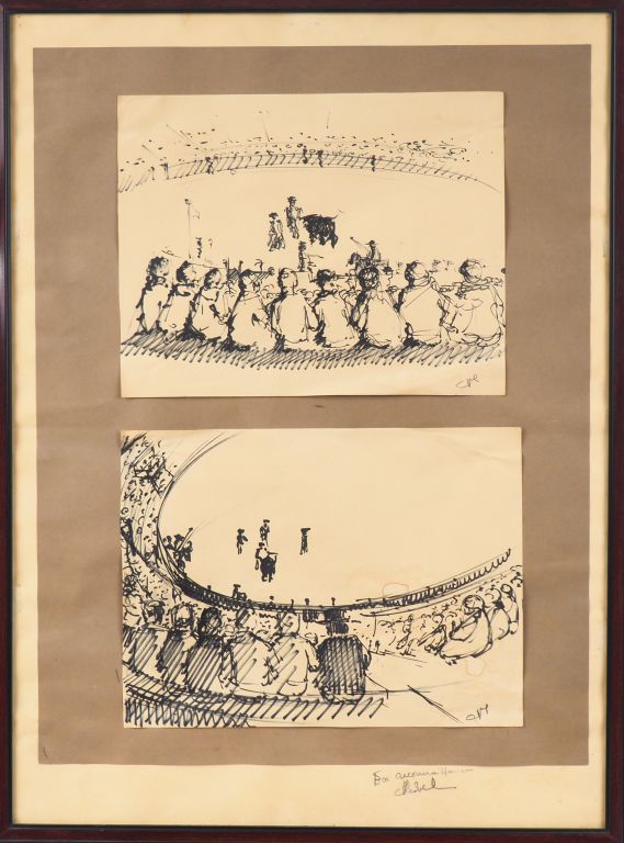 Ecole française XXème. "Scènes de corrida". 2 dessins au feutre dans un même encadrement, monogrammés Dim. 27 x 35 cm. (chacun).