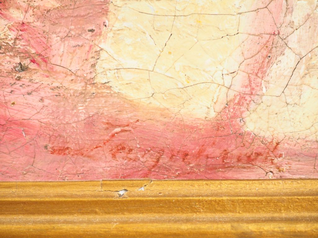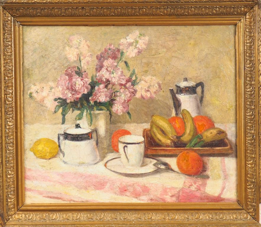 Ecole française XXème. "Table dressée". Huile sur toile, signée en bas à droite. Dim. 50 x 61 cm. (craquelures).