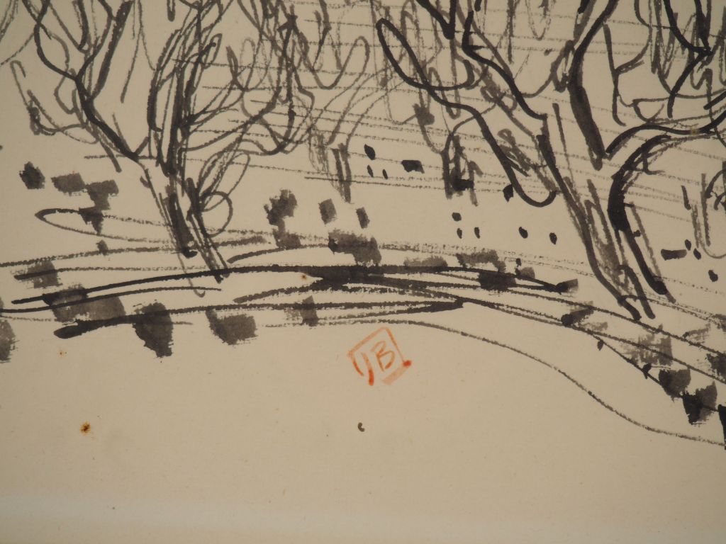 Ecole française Xxème. "Village fortifiée en bord de mer" Encre, monogrammée Dim à vue. 28,5 x 34,5 cm