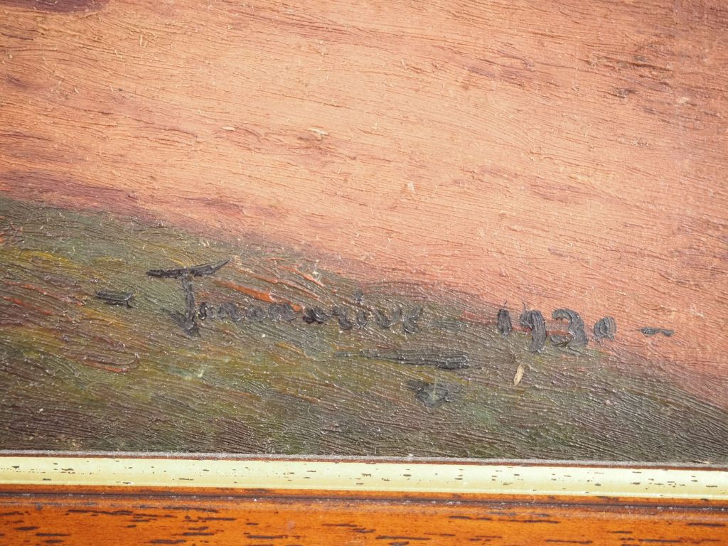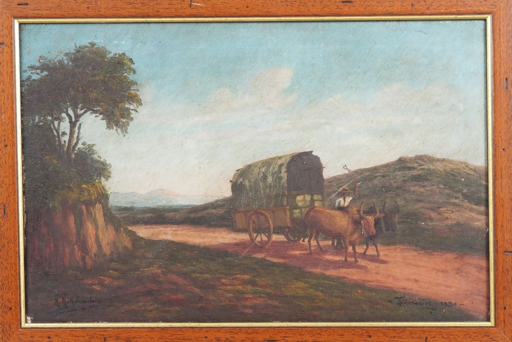 Ecole malgache début XXème. "charrette couverte trainée par des bœufs" Huile sur toile, signée en bas à gauche et datée 1930 Dim. 30 x 46 cm