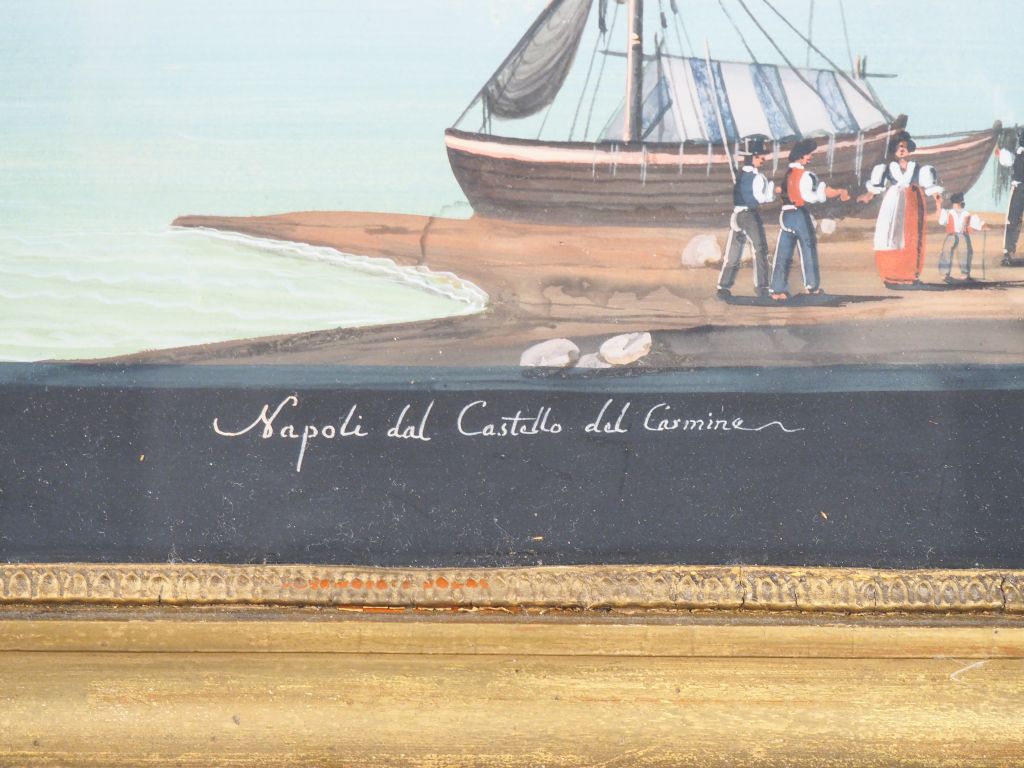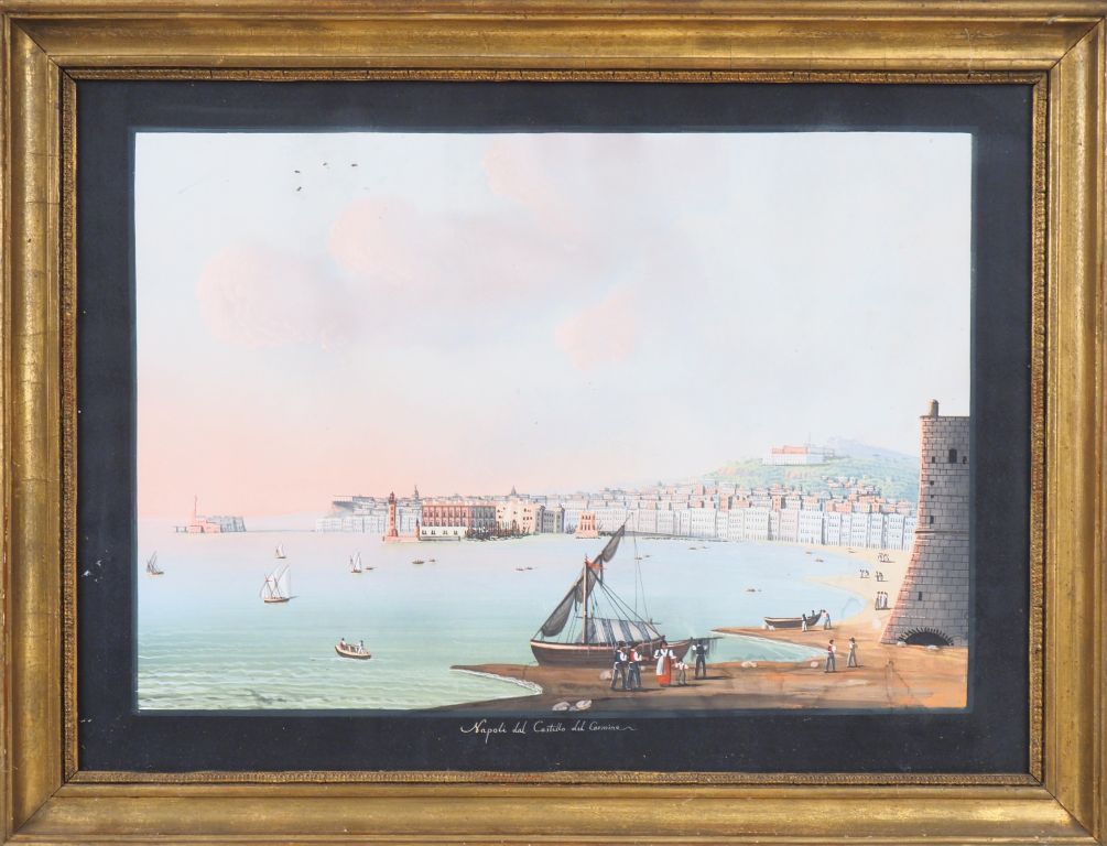 Ecole Napolitaine XIXème. "Napoli dal castello del carmine". Gouache. Dim. (à vue) : 28 x 41 cm.