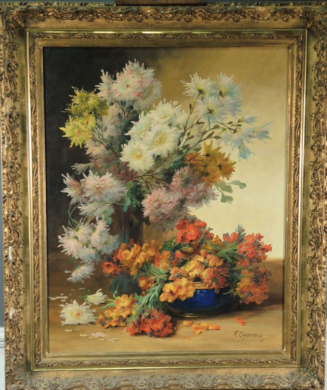 Edmond van COPPENOLLE. " Jeté de fleurs ". Huile sur toile, signée en bas à gauche . 89 x 70 cm (accident).