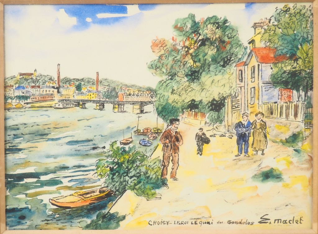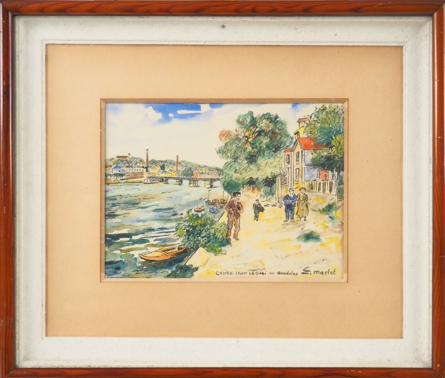 Elisée MACLET. "Choisy le Roi, le quai des gondoles". Aquarelle, signée en bas à droite. Dim. 17,5 x 24 cm