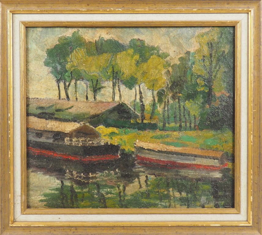 Elisée MACLET. "Péniches en bord de rivière". Huile sur carton, signée en bas à droite. Dim. 35 x 41 cm.