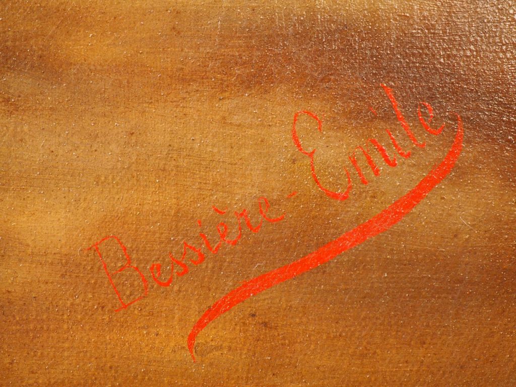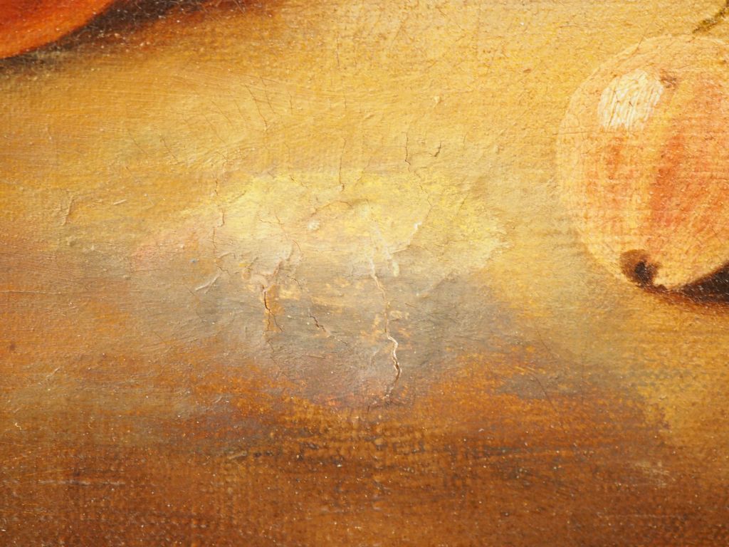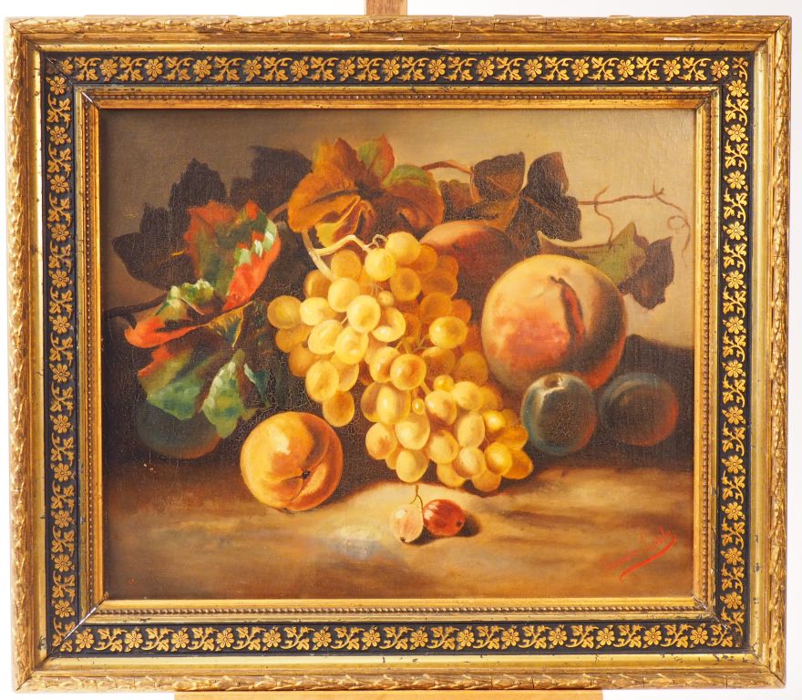 Emile BESSIERE. 'Nature morte aux fruits'. Huile sur toile. Signée en bas à droite. Dim. : 38 x 44 cm. (accident et restauration)