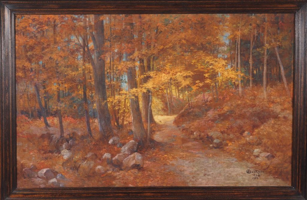 Emile DECKERS. "Sous bois en automne" Huile sur toile, signée en bas à droite et datée 1936 Située à Spa Dim. 73 x 116 cm (petits accidents)