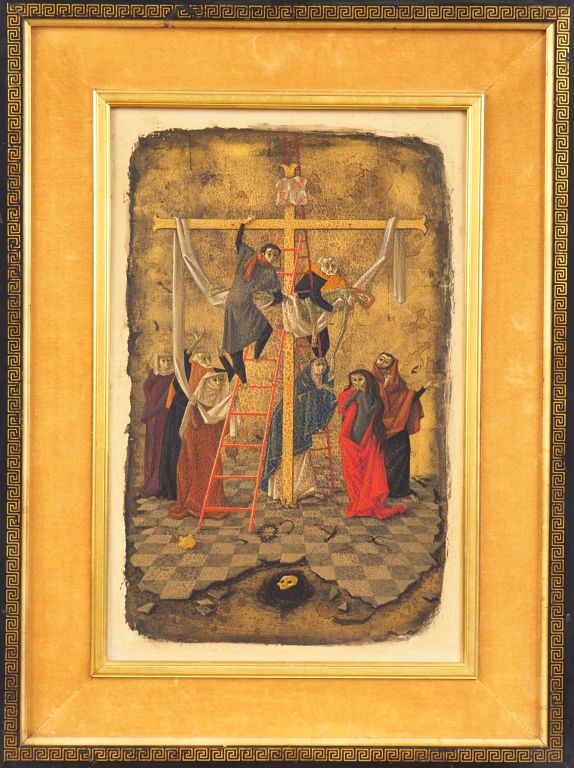Enrico BRANDANI. "Descente de Croix". Huile sur carton, signée au dos et datée 1961, dédicacée à Charles Zahar. Dim. 41,5 x 27 cm.