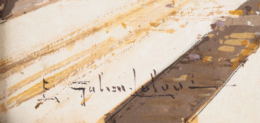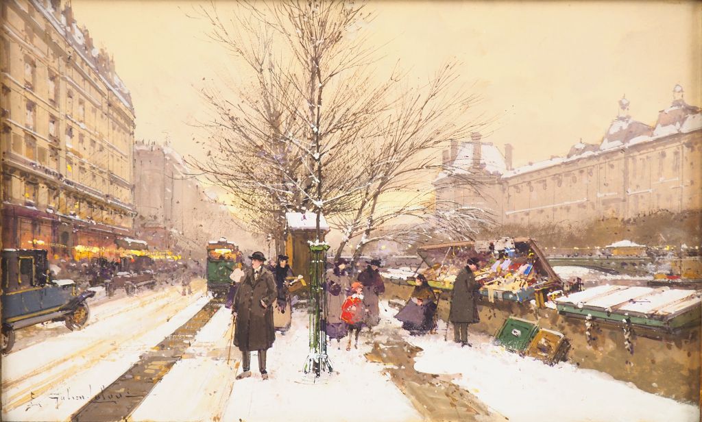 Eugène GALIEN-LALOUE. "Quai Voltaire". Aquarelle gouachée sur papier, signée en bas à gauche. Dim. 19,5 x 31,5 cm.