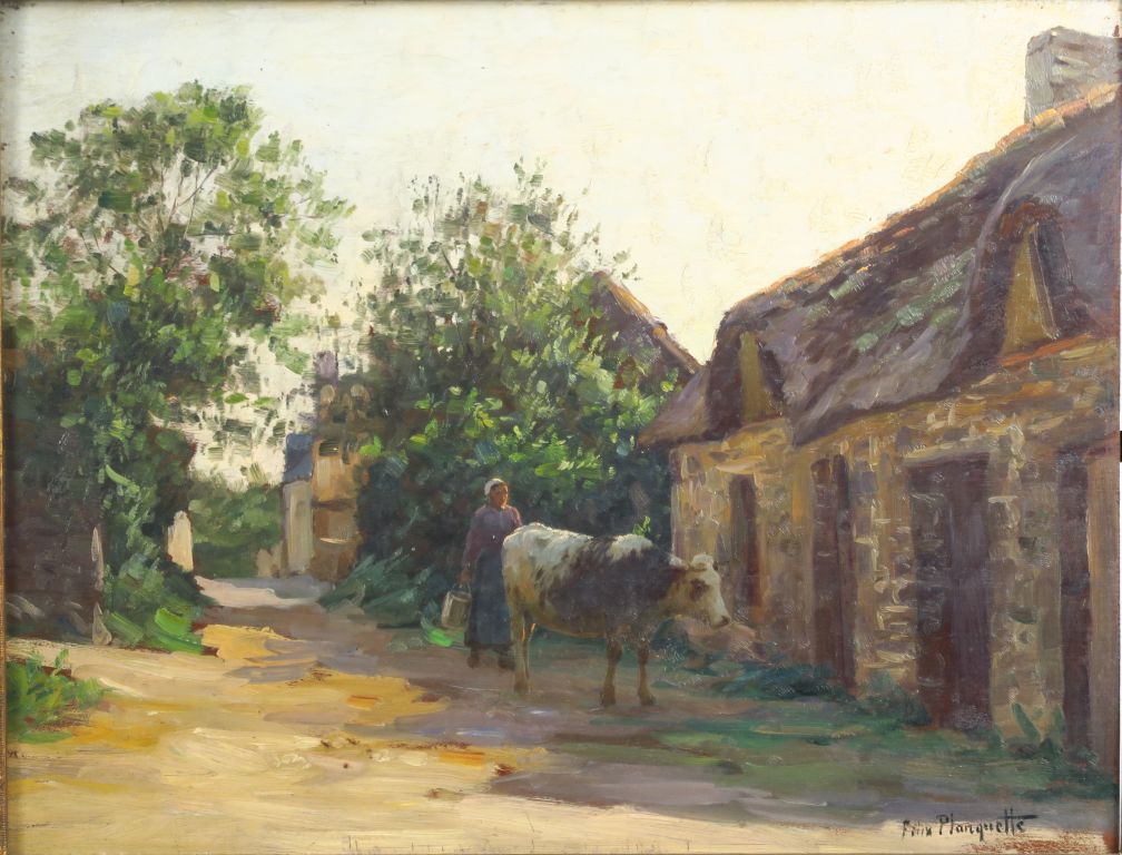 Félix PLANQUETTE "Fermière menant sa vache à l'étable" Huile sur panneau. Signée en bas à droite. 32 x 41 cm