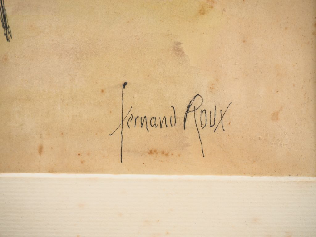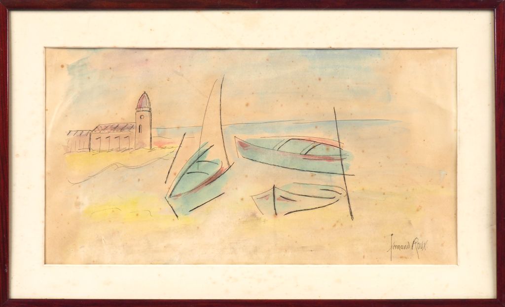 Fernand ROUX. "Barques sur la plage". Aquarelle, signée en bas à droite. Dim. (à vue) : 22 x 42 cm. (Etat moyen).